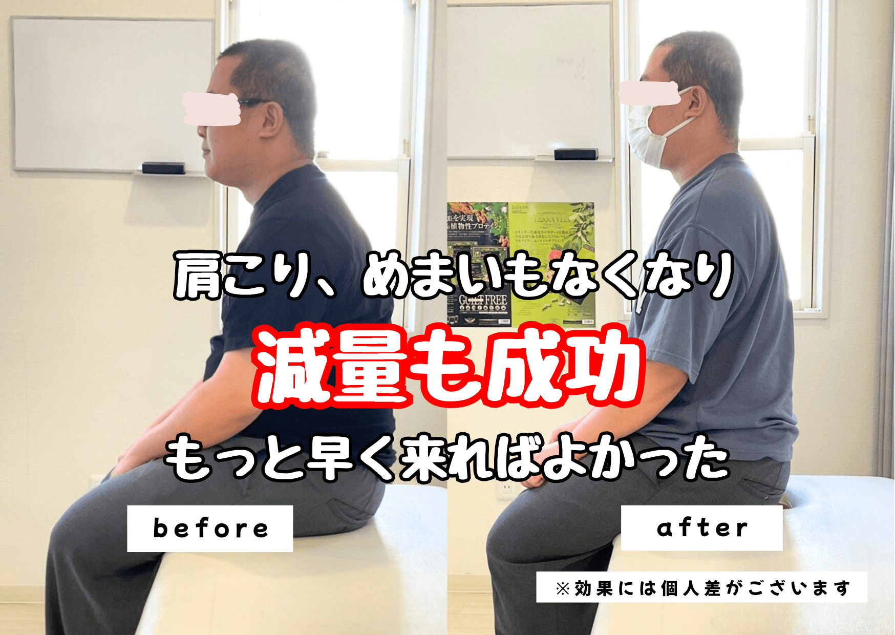 ダイエットについてはここからが本番ですが、今回の施術で全身の血流が促進され、脂肪を燃焼しやすい「痩せるための土台」は整いました。肩こり、めまいが楽になり、体がスムーズに動くようになったことで、これから始まるエクササイズもより効果的に行えるはずです。