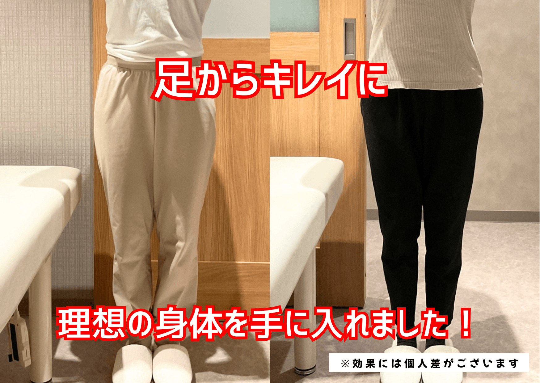 A. 個人差はありますが、1回の施術でも「足の軽さ」や「ラインの変化」を実感される方が多いです。定着させて根本から体質を変えるには、ダイエットページと同様に、まずは3ヶ月を一つの目安としておすすめしています。